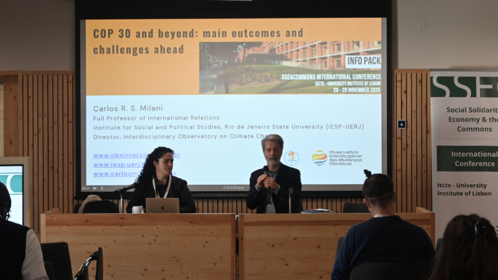 Nos últimos meses de 2025, o Prof. Carlos R. S. Milani fez uma breve viagem ao continente europeu para representar o Observatório em compromissos acadêmicos promovidos por instituições de Portugal e da Itália. Em 26 de novembro, o Diretor do OIMC foi convidado a ministrar a palestra de abertura da Conferência Internacional sobre a Economia Social e Solidária e os Comuns (SSEC), organizada pelo Instituto Universitário de Lisboa (Iscte). Intitulada O legado da COP 30: resultados e desafios, a conferência inaugurou as atividades da quinta edição do evento, dedicada ao tema Colapso e Regeneração: iniciativas comunitárias prefigurando futuros sustentáveis.