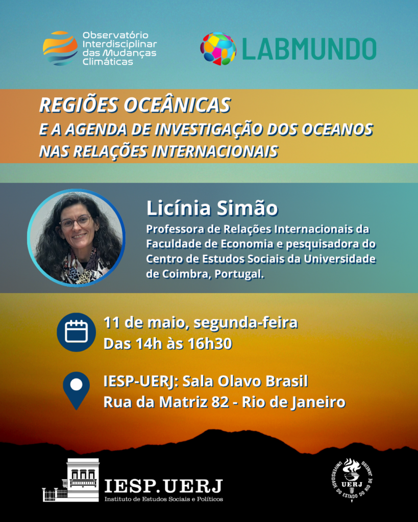 No dia 11 de maio de 2026, segunda-feira, o Observatório Interdisciplinar das Mudanças Climáticas e o Laboratório de Análise Política Mundial (LABMUNDO) recebem a Prof. Licínia Simão (Universidade de Coimbra – Portugal) no Instituto de Estudos Sociais e Políticos (IESP-UERJ), para ministrar a palestra Regiões Oceânicas e a agenda de investigação dos oceanos nas Relações Internacionais. Entre 14h30 e 16h30, na Sala Olavo Brasil, a professora de Relações Internacionais da Faculdade de Economia da Universidade de Coimbra (FEUC) apresenta os principais elementos da agenda de investigação em torno das regiões oceânicas, a partir de sua pesquisa desenvolvida em colaboração com o Ocean Regions Programme da Universidade de Pretória, na África do Sul.